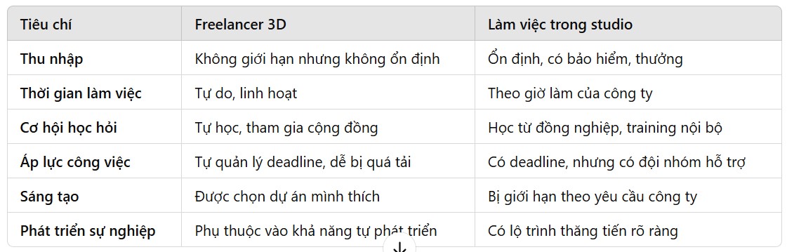 Ngành công nghiệp 3D ngày càng phát triển, mang đến nhiều cơ hội việc làm cho các họa sĩ 3D. Khi bắt đầu sự nghiệp, bạn sẽ đứng trước một quyết định quan trọng: nên làm freelancer 3D hay làm việc trong studio?